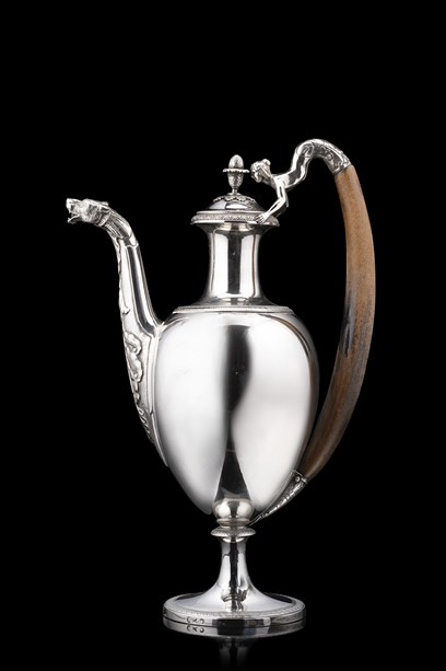 Caffettiera in argento a corpo ovoidale liscio con beccuccio zoomorfo. Ansa in legno sostenuta da sirena in argento e presa a guisa di pigna a tutto tondo, bordure decorate a palmette e motivi concatenati. Milano, 1820. Argentiere Emanuele Caber (h. cm 32) (g lordi 1046 ca.)