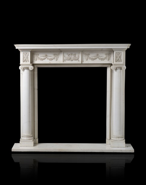Camino neoclassico in marmo bianco con due colonne tornite a tutto tondo e architrave scolpito a fregi e cigni. Secolo XIX (cm 124x114x22) (lievi difetti)