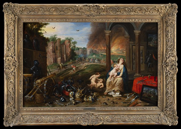 Allegoria del Tatto: madre con bambino sotto un portico con un cumulo di armature, scontro di cavalleria e città in fiamme sullo sfondo