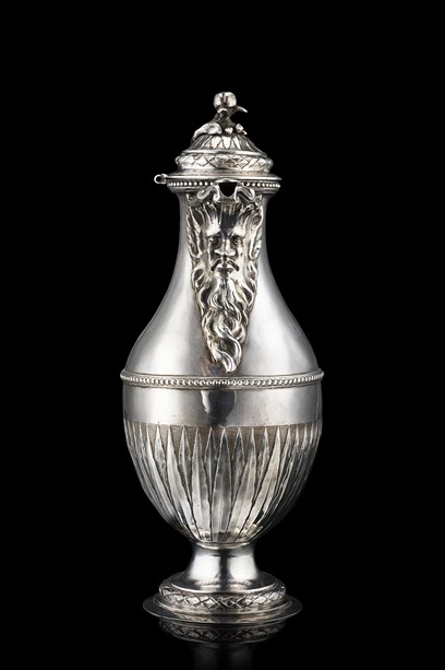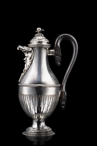 Caffettiera in argento a corpo ovoidale con versatoio decorato da mascherone, ansa sagomata in legno ebanizzato e presa a guisa di frutto stilizzato a tutto tondo. Stato Pontificio, Roma, secolo XVIII. Argentiere Giuseppe Grazioli (h. cm 33) (g lordi 870 ca.) (restauri all'ansa)