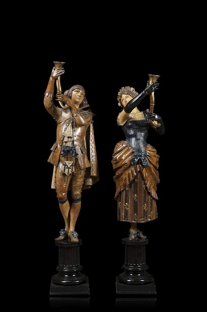 Coppia di sculture in legno laccato e scolpito raffiguranti personaggi della Commedia dell'Arte in abiti ottocenteschi, vesti con dettagli dorati. Su basi a colonna scanalata. Napoli, secolo XIX (h. cm 225) (difetti)