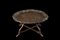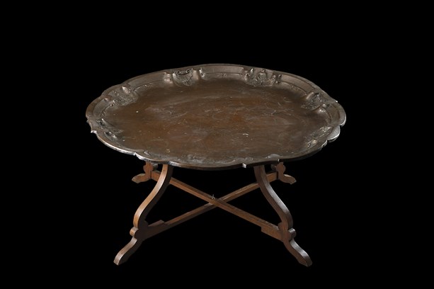 Tavolo da fumo con vassoio di forma mistilinea in rame sbalzato a conchiglie, volute e motivi vegetali. Fine secolo XIX (diam. cm 97) Sostegno pieghevole in legno (h. cm 47) (difetti)