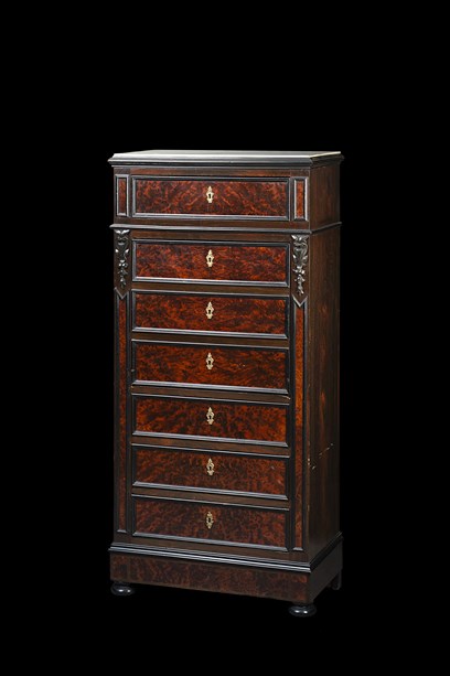 Secretaire lastronato in radica, fronte a quattro cassetti e anta ribaltabile c