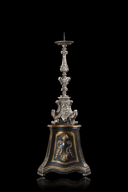 Candeliere in legno intagliato e argentato a volute fogliate, poggiante su base sagomata, laccata, dorata e scolpita a fregi. Secolo XIX (h. cm 140) (difetti)