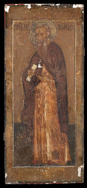 Russian art, 18th century. Oil on panel icon representing a saint (cm 99,5x44) (losses and restorations)