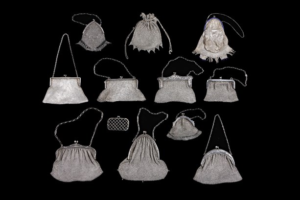 Collezione di dodici borsette in maglia d'argento e argento di diverso decoro.