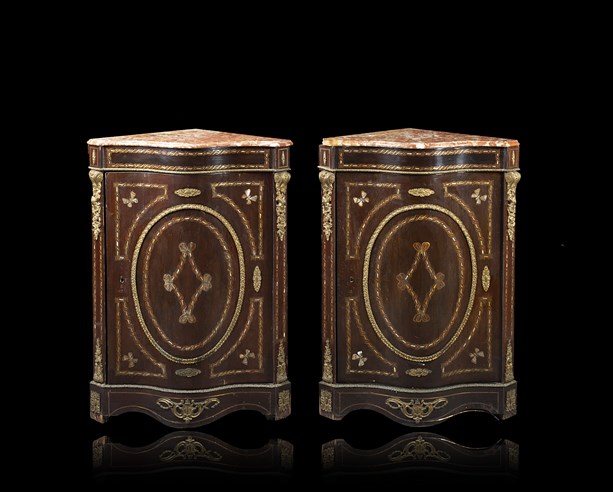 A pair of mahogany veneered and mother-of pearl, brass and various woods inlaid corner cabinets. Marble tops. Naples, 19th century (cm 74x104x48) (defects and losses)