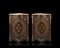 Coppia di angoliere lastronate in mogano con fronte ad un'anta di forma mossa, intarsiate in madreperla, ottone e legni vari a nastri e farfalle. Montanti e fregi in bronzo dorato. Piani sagomati in marmo. Napoli, secolo XIX (cm 74x104x48) (difetti e mancanze)