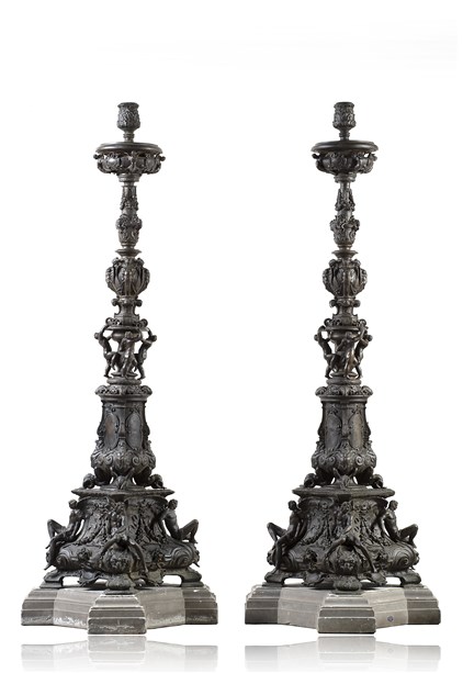 A pair of important bronze candle holders. Naples, early 19th century (h. cm 192) Grey marble base
