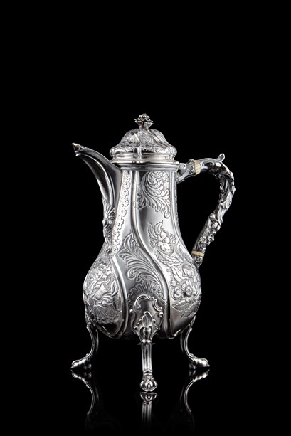 Caffettiera in argento a corpo piriforme costolato e sbalzato a motivi floreali. Coperchio con presa a fiore a tutto tondo, ansa di forma mossa con inserti in avorio. Piedi ad artiglio. Secolo XIX, marchi non decifrati (h. cm 32) (g 990 ca.) (difetti)