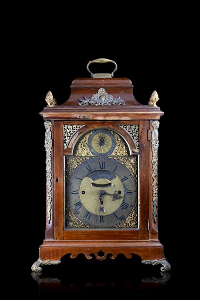 Orologio da appoggio del tipo "bracket" con cassa in legno ed inserti in bronzo dorato.