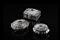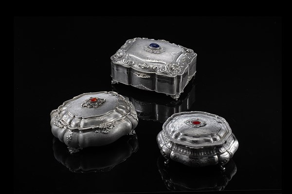 Gruppo di tre scatole in argento inciso e cesellato in rilievo a fiori, coperchi decorati con cabochon in pietre semipreziose (g lordi 1700 ca.) (difetti)