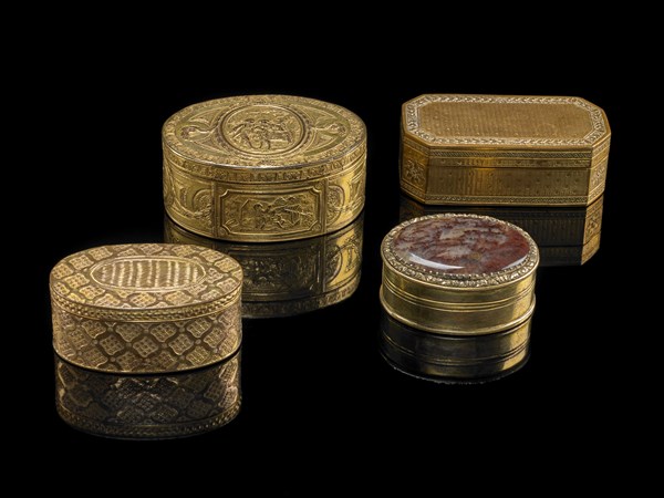 Lotto composto da quattro tabacchiere in metallo dorato di diversi decori ed epoche. Una con coperchio in quarzo dentritico (lievi difetti)