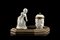 Manifatture del secolo XVIII. Calamaio con base ottagonale sormontata da un vaschetta in porcellana bianca decorata in rilievo a fiori e da una figura di donna a tuttotondo, ghiere in metallo dorato (cm 24x14x16) (difetti e mancanze)