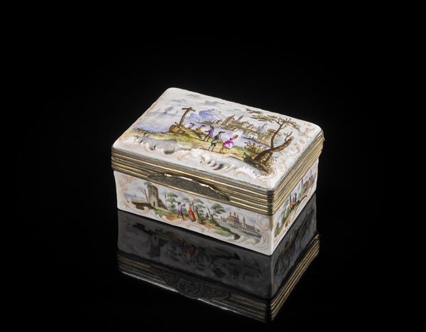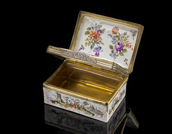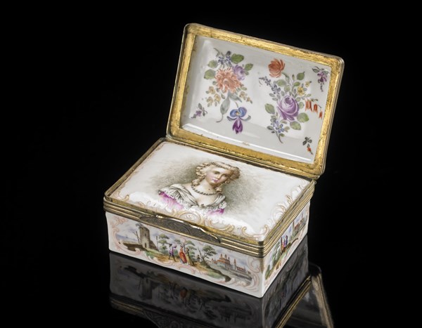 Manifattura tedesca, fine secolo XVIII. Tabacchiera in porcellana a doppio coperchio decorata nella base e sulle fasce a paesaggi policromi. Interno dipinto a mazzo di fiori con ritratto di dama con collana di perle e dorature sul secondo coperchio. Ghiere in metallo dorato (cm 7,5x4x6) (difetti e mancanze)
