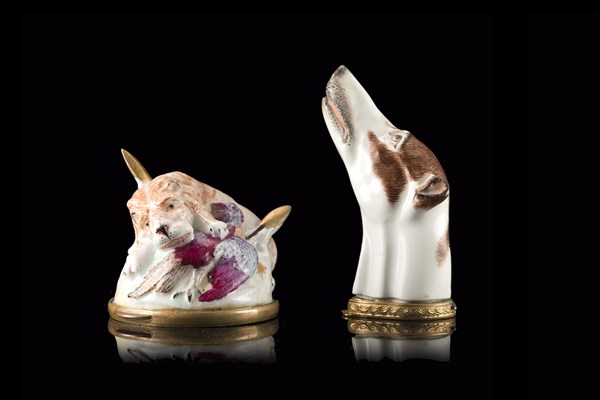 Manifatture tedesche, inizio secolo XVIII. Lotto composto da due tabacchiere, una raffigurante una testa di levriero e l'altra una testa di leone. Chiusure in bronzo inciso a volute (misure diverse, difetti)