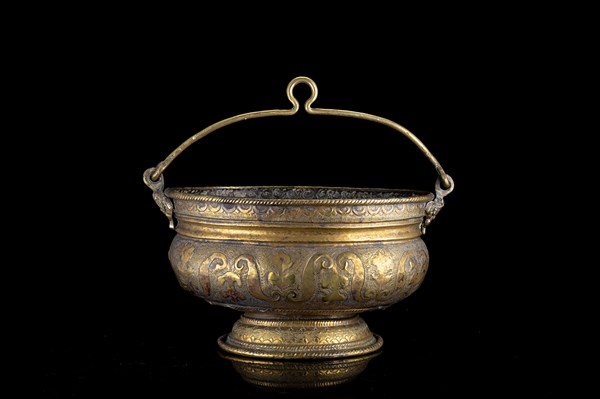 Secchiello in rame dorato inciso e sbalzato a volute fogliate, ansa sagomata so