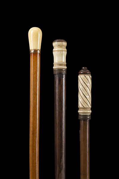 Manifatture diverse del secolo XIX, gruppo di tre bastoni con prese in avorio (