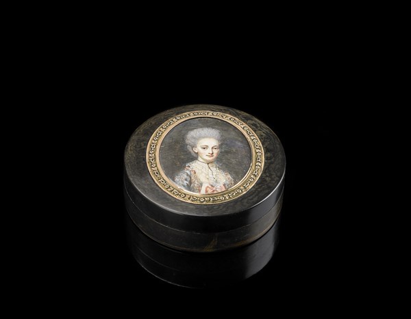 Tabacchiera di forma tonda in tartaruga con miniatura raffigurante gentildonna