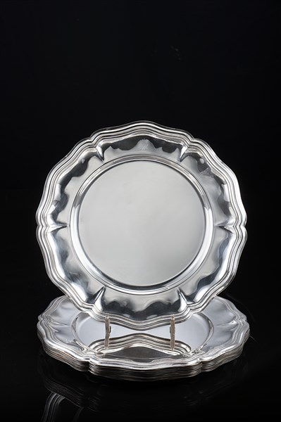 Gruppo di dieci sottopiatti in argento, bordo mistilineo, cifrati "M" con corona ducale. Titolo 800 (d. cm 30) (g 5000 ca.)