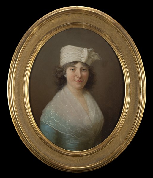 "Ritratto di dama in veste azzurra e cuffia bianca" olio su tela ovale (cm 68x55) Firmato in basso a destra. In cornice coeva in legno dorato (difetti)
