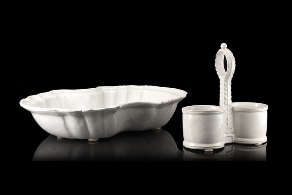 Manifattura di Sassuolo, secolo XVIII. Lotto composto da un cruet ed un bacile in maiolica smaltata in bianco (lievi difetti)