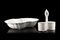 Manufacture of Sassulo, 18th century. Lot composed by a white enamelled majolica cruet and a basin (minor defects)