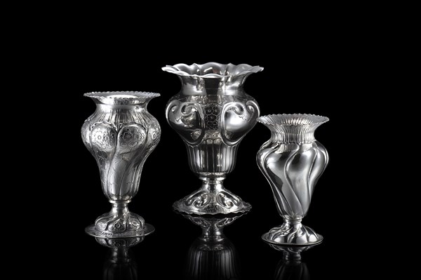 Gruppo di tre vasi portafiori in argento in stile veneto con corpi incisi a fiori e motivi stilizzati (h. max cm 22) (g 1200 ca.)