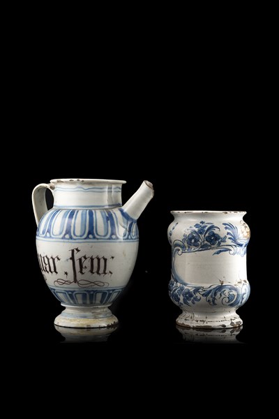 Different manufactures, 18th century. Lot comprising an albarello and a jug (h. max cm 22) (defects and losses)