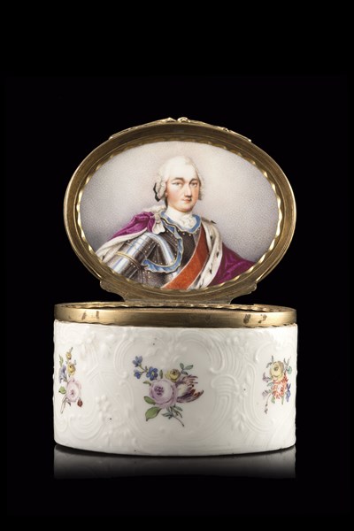 Manifattura tedesca, seconda metà secolo XVIII. Scatola in porcellana decorata in policromia a fiori e in rilievo a volute. Coperchio con scena di battaglia, interno dorato e con ritratto di Carlo Teodoro elettore palatino (cm 8x4,5x6,5)