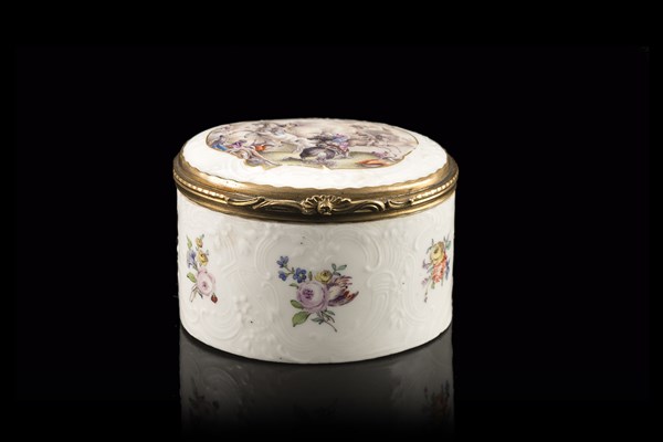 Manifattura tedesca, seconda metà secolo XVIII. Scatola in porcellana decorata