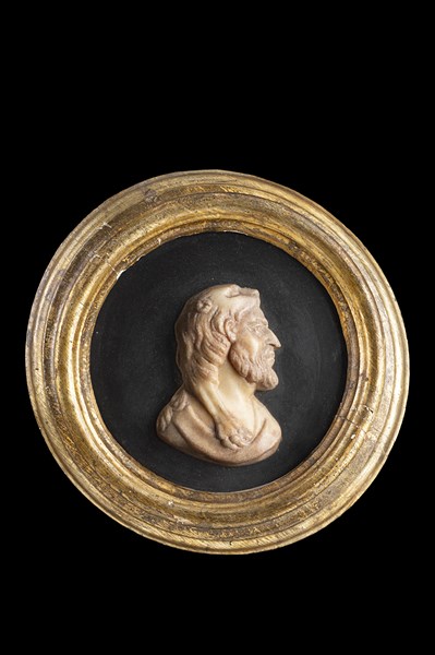 Lotto 241 | Profilo di Ercole in marmo su supporto in lavagna (d. cm 16) In cornice dorata