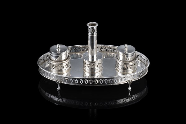 Calamaio in argento con fasce incise e traforate a palmette, piedini stilizzati. Regno Lombardo-Veneto, secolo XIX (cm 26x17) (g 420 ca.)