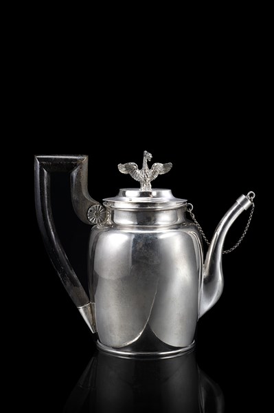 Teiera in argento a corpo liscio con coperchio sormontato da aquila ad ali spiegate a tutto tondo, ansa in legno ebanizzato. Probabilmente area germanica, fine secolo XVIII/ inizio secolo XIX (h. cm 18) (g lordi 495 ca.)