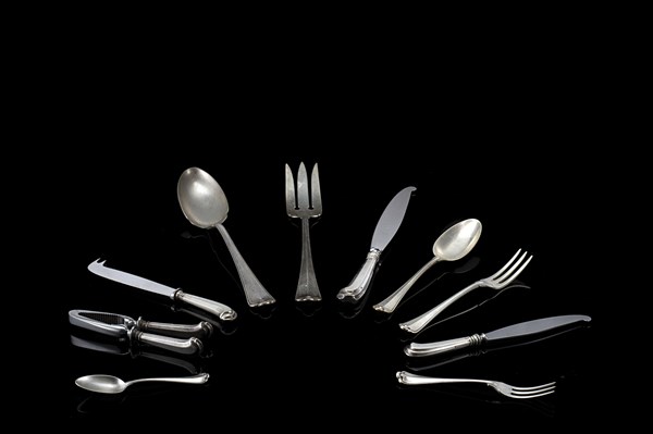Servizio di posate in argento composto da: sei forchette, sei coltelli, sei cucchiai, sei forchettine e sei coltelli da dolce, sei cucchiaini, due posate a servire, un coltello da formaggio e uno schiaccianoci. Marchi San Marco, secolo XX (g 1500 ca.)