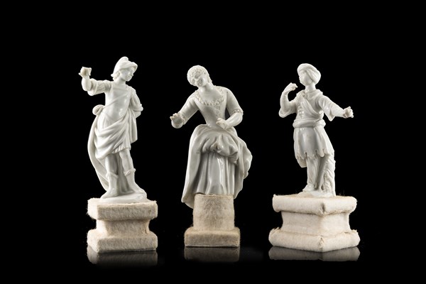 Manifattura di Ginori, Doccia, secolo XVIII. Gruppo di tre figure diverse in porcellana bianca (h. max cm 11) (difetti e mancanze)