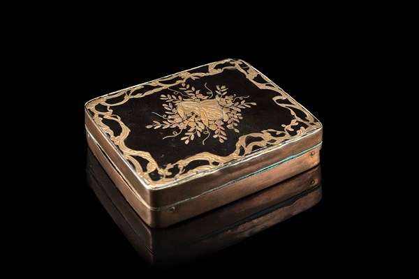 Tabacchiera in tartaruga intarsiata sul coperchio in oro basso con trionfo della musica entro volute. Fascia in rame. Secolo XIX (cm 8x2x6) (difetti e restauri)