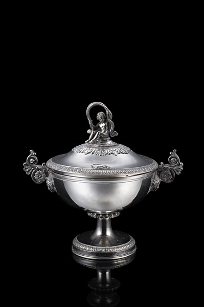 Zuccheriera biansata in argento, coperchio con bordi decorati a palmette sormontato da presa a guisa di fanciullo a tutto tondo, anse a volute fogliate e fiori con attaccatura a teste femminili. Regno Lombardo-Veneto, Milano, seconda metà secolo XIX. Argentiere Francesco Ceppi (h. cm 20) (g lordi 680 ca.) (lievi difetti)