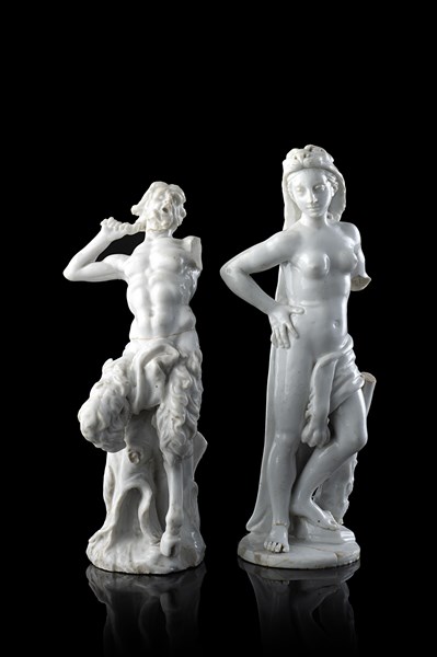 Veneto manufacture, 18th century "Faun and Fortitude" two white porcelain figures (h. cm 16) (defects and losses)
