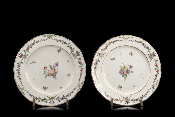 Lotto 277 | Manifattura Cozzi, secolo XVIII. Coppia di piatti in porcellana con bordi dorat