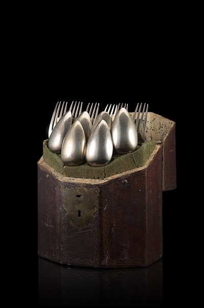 Servizio di posate in argento composto da: sei forchette, sei cucchiai e sei coltelli cifrati "BV", fine secolo XVIII. In custodia (g 1300 ca.) (lievi difetti)