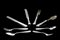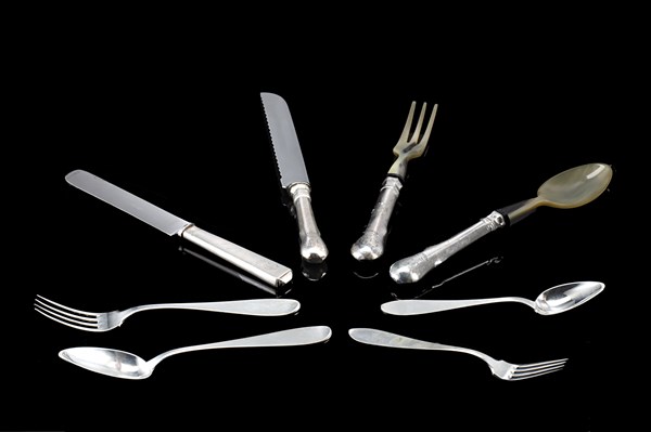 Parte di servizio di posate in argento a corpo liscio con cifre "CBL" coronate composto da: ventisei forchette, ventiquattro cucchiai, dodici forchettine, dodici cucchiai da dolce, tre posate a servire, ventisei coltelli. Milano, secolo XIX (g 4180 ca.)