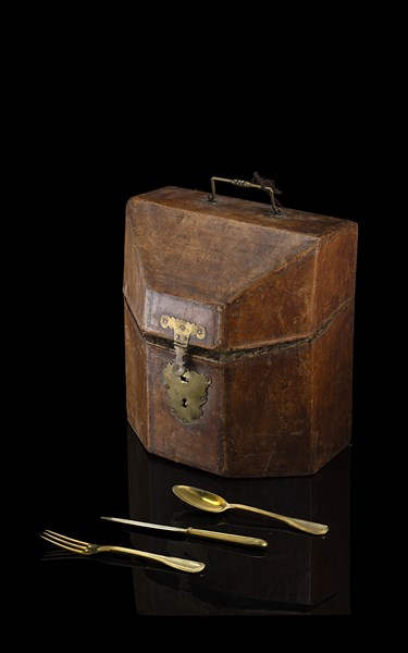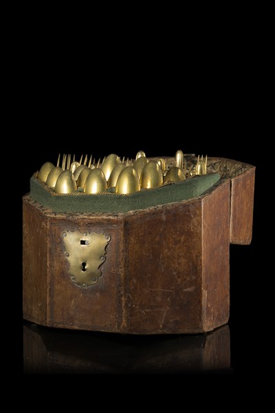 Servizio di posate in metallo dorato composto da: dodici forchette, dodici coltelli e dodici cucchiai, in custodia in pelle impressa in oro. Fine secolo XVIII (cm 27x30) (difetti)