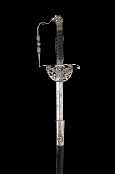 Spada degli Antichi Stati appartenuta ad un dignitario del ducato di Modena. Impugnatura con guance in ebano quadrellato sormontata da testa leonina finemente cesellata.