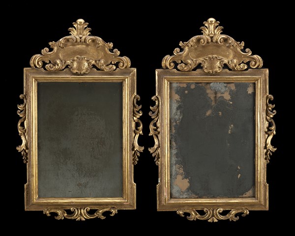 Coppia di specchiere in legno intagliato e dorato con cimase scolpite a volute fogliate ed incise con stemmi ducali, fregi traforati. Emilia, secolo XVIII (cm 120x70) (difetti)