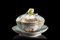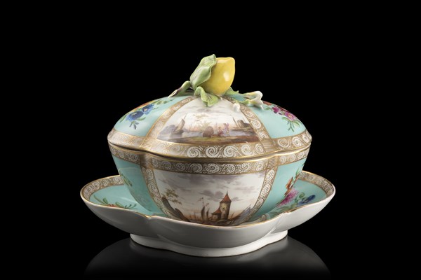 Manifattura tedesca, Augustus Rex, secolo XIX. Scatola in porcellana con vassoio decorata in policromia a fiori e riserve con scene portuali, presa del coperchio a forma di limone e fiori a tutto tondo (h. cm 20)