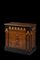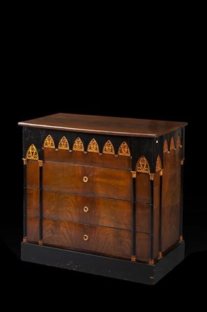 Comoncino lastronato in radica e piuma di mogano, cinque cassetti con decoro di gusto neogotico in legno traforato. Secolo XIX (cm 90x86x49) (difetti)