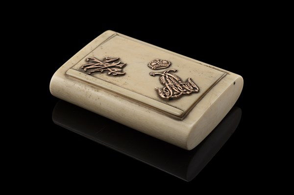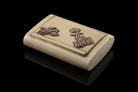 Tabacchiera in avorio con coperchio decorato da cifre in oro. Fine secolo XIX (