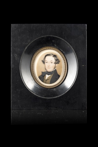 Maestro del secolo XIX "Ritratto di gentiluomo con gilet con filo d'oro" miniatura ovale su avorio (cm 5x4) In cornice ebanizzata