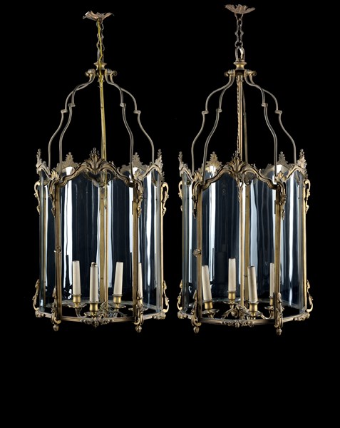 Coppia di lanterne a quattro luci in bronzo dorato e vetro. Fine secolo XIX (h.